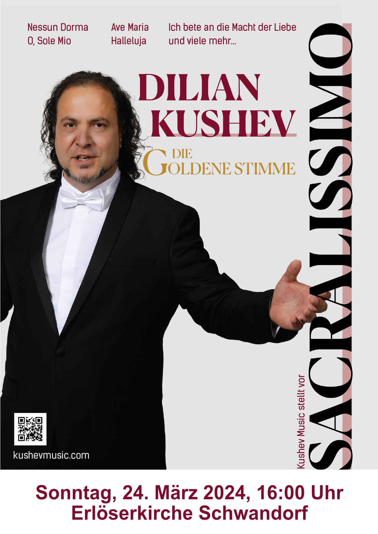 Am Sonntag, 24. März 2024 um 16:00 Uhr gibt der Sänger Dilian Kushev ein Solokonzert in der Evangelisch-Lutherischen Erlöserkirche in Schwandorf.